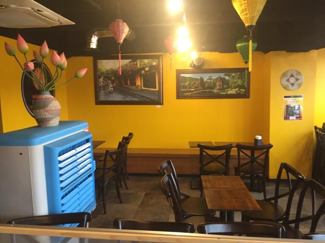 黄色が基調の壁に提灯もあるのでベトナム中部のホイアンをイメージしたような内装。恐らくベトナムから輸入したであろう木製のテーブルと椅子。