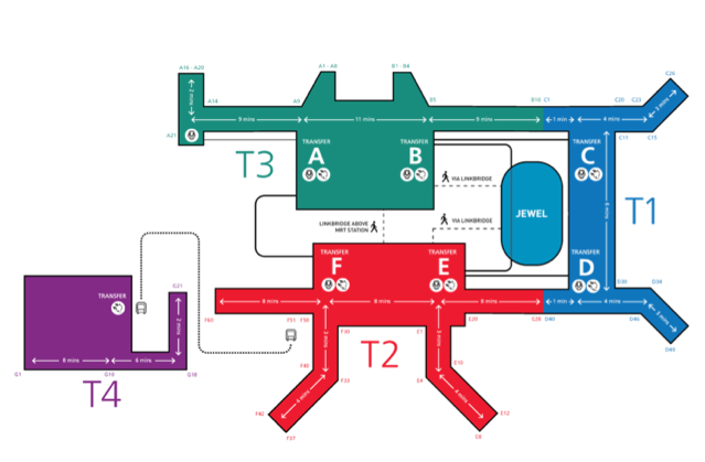 ※画像はchangiairport.comより、効率的なラウンジ巡りにはターミナルマップで移動の計画を